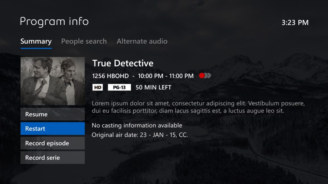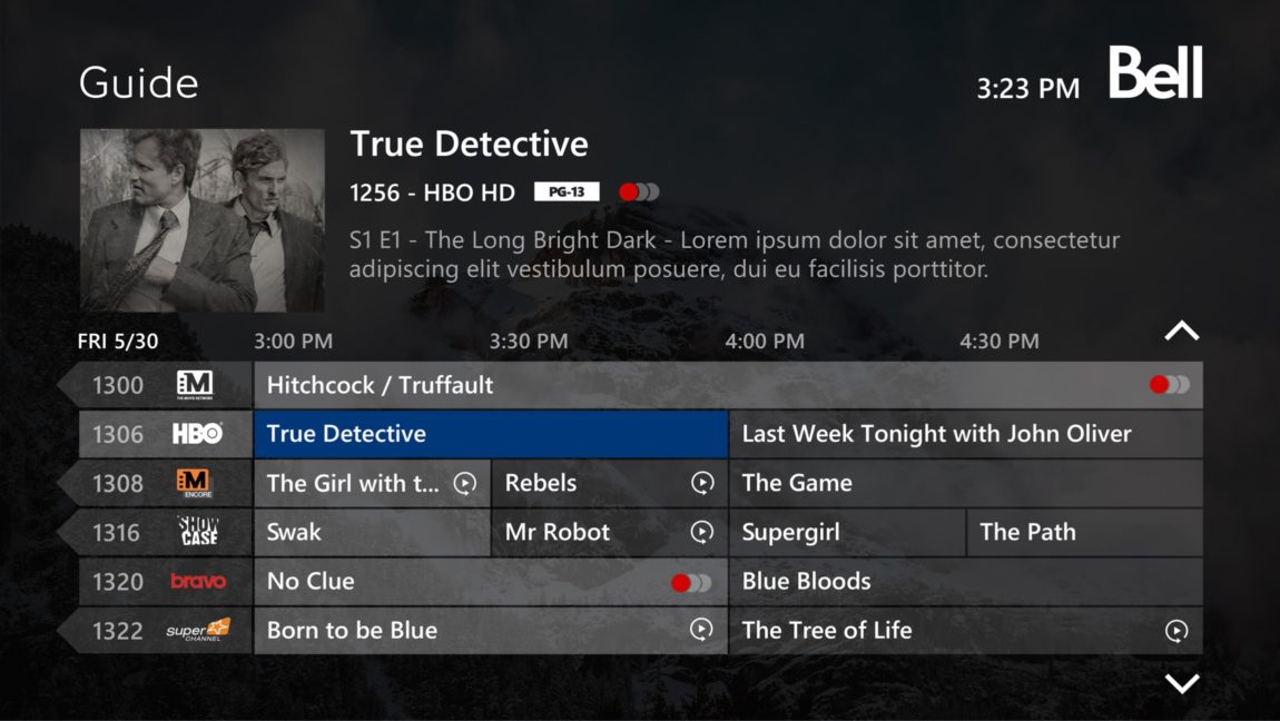 En 2015, Bell Canada mandate Blache Yong & Co. afin de rafraîchir sa plateforme Télé Fibe en plus de repenser certaines fonctionnalités. Plus simple visuellement, elle permet une navigation claire pour les utilisateurs du service et une cohérence plus grande entre les diverses sections de contenu. L’équipe s’appuyant sur une forte expertise dans le domaine des interfaces télé, a réussi à créer une expérience à mille lieux de la compétition à l’échelle nationale.